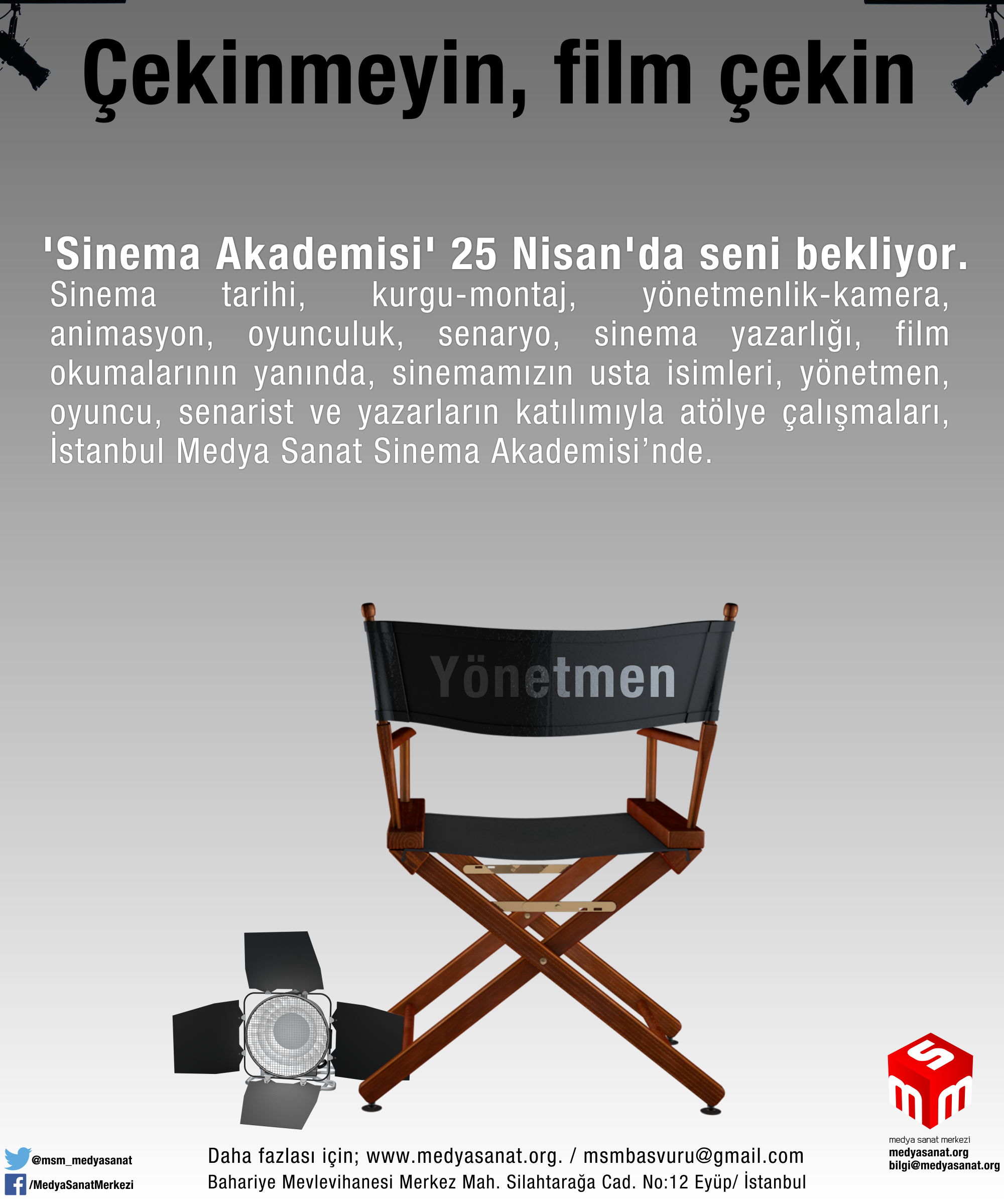 Dünyaya İstanbul ufkuyla bakma gayesiyle yola koyulan ve bu minvalde medya-sanat alanında faaliyetler yürüten İstanbul Medya Sanat Derneği’nde ‘Sinema Akademisi’ başlıyor. 25 Nisan’da başlayacak akademi, 9 haftada tamamlanacak. İstanbul Medya Sanat Sinema Akademisi’nin dersleri cuma ve pazar günleri Eyüp Bahariye Mevlevihanesi’nde görülecek. Sinema tarihi, kurgu-montaj, yönetmenlik-kamera, animasyon, oyunculuk, senaryo ve sinema yazarlığı derslerinin yanı sıra film okumaları da akademi müfredatında yer alıyor. Yönetmen Ensar Altay, senarist Oktay Berber, yazar Bünyamin Yılmaz, oyuncu Osman Doğan gibi alanında kendini ispat etmiş isimlerin ders vereceği akademide ayrıca sinemamızın usta isimleri, yönetmen, oyuncu, senarist ve yazarların katılımıyla her hafta bir atölye yapılacak. ‘WorkShop’ kapsamında hayata geçirilecek atölyelerde önemli isimler gençlere tecrübelerini aktaracak. Derslerin oluşturacağı altyapı ile gençler, akademinin son döneminde kendi filmlerini çekecek. Eğitimle ilgilinenlerin Bahariye Mevlevihanesi, Merkez Mah. Silahtarağa Cad. NO:12 Eyüp/ İSTANBUL adresine şahsen gelerek ya da msmbasvuru@gmail.com adresine mail ile başvurmaları gerekmektedir.